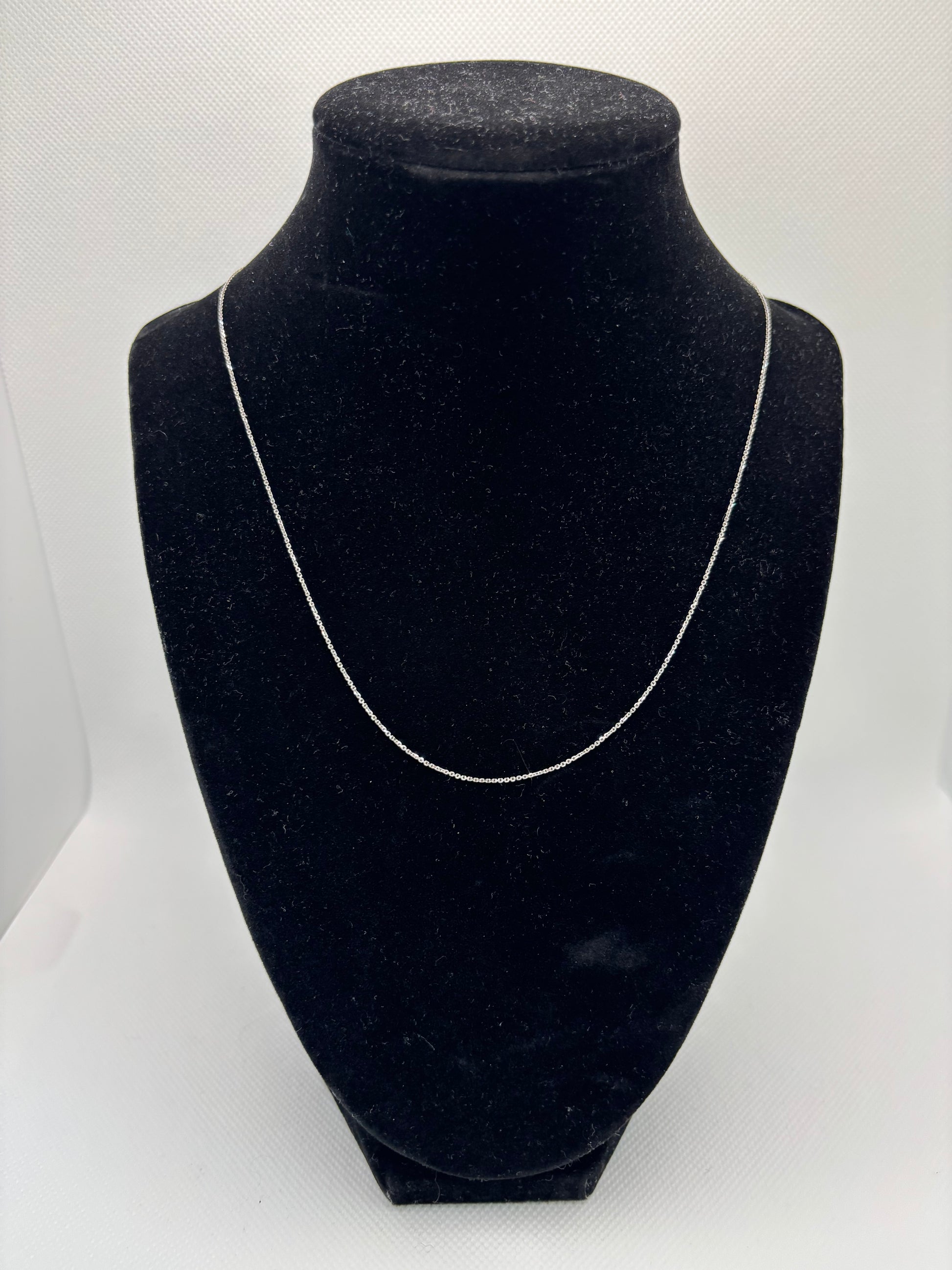 This brand new 14K White Gold Chain Necklace is a delicate and elegant piece that adds a touch of sophistication to any jewelry collection. Weighing 1.36g of high-quality 14K white gold, the chain features a sleek and minimal design, making it perfect for layering or wearing on its own. Its versatile style can be paired with a pendant for a personalized look or worn simply for a refined, understated touch of luxury.